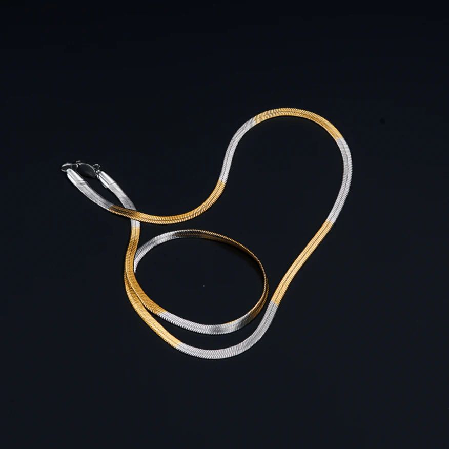 Make a bold statement with this thick snake chain featuring a striking gold and silver mix combination. The dual-tone finish adds a modern edge while maintaining a timeless appeal, making it perfect for both casual and formal wear. Its sturdy build and sleek shine ensure durability with a luxurious look, making it an essential addition to your jewelry collection.